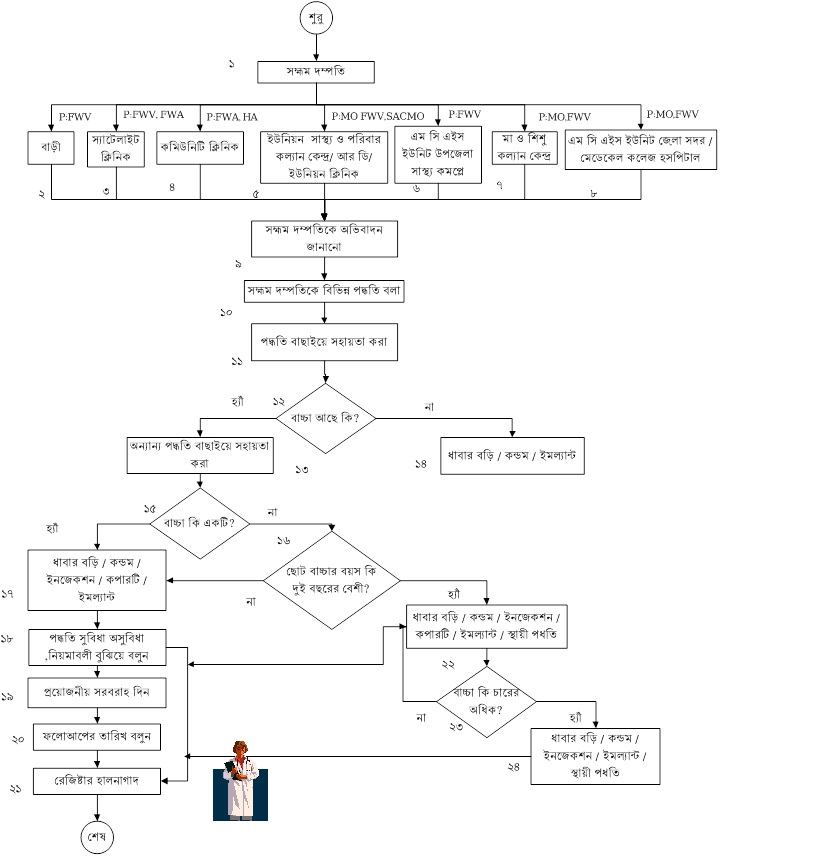প্রতিটি ইউনিয়নে পরিবার পরিকল্পনা পরিদর্শক(FPI) গণ এর তত্বাবধানে প্রতিটি ওয়ার্ডে ইউনিট ভিত্তিক পরিবার কল্যাণ সহকারী(FWA) গণ বাড়ি বাড়ি পরিদর্শনের মাধ্যমে এবং অগ্রিম কর্মসূচী অনুযায়ী সপ্তাহে ০৩(তিন দিন) নির্ধারিত কমিউনিটি ক্লিনিক হতে,প্রতিটি ইউনিয়ন স্বাস্থ্য ও পরিবার কল্যাণ কেন্দ্রে এবং স্যাটেলাইট ক্লিনিক হতে পরিবার কল্যাণ পরিদর্শিকা (FWV) ও উপ- সহকারী কমিউনিটি মেডিকেল অফিসার(SACMO) এর মাধ্যমে এই সেবা প্রদান করা হয়।